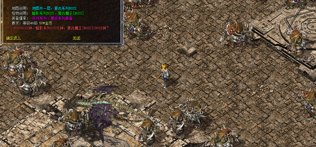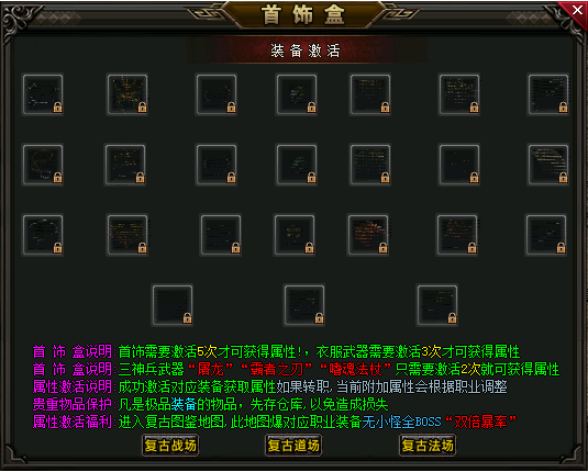 装备介绍:商店货→沃玛→祖玛→赤月套→复古战狂→所有装备暴率适中,绝不会烂安全区的存在长期养老!