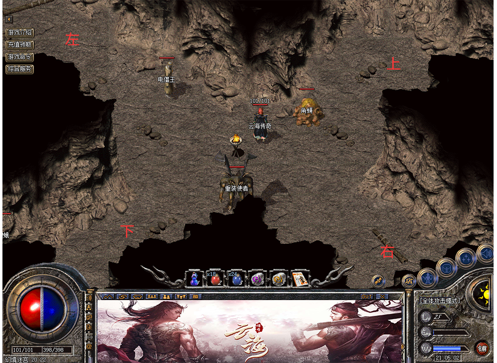 高级地图:幻境(工作日二倍经验,周末三倍经验,一层~六层适合升级,七层~十层打装备),影之道(盟重安全区左下角传送),牛魔大厅,封魔殿,赤月祭坛,赤月峡谷,祖玛七层